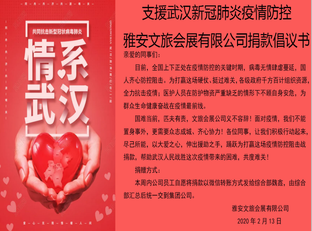 文旅會展公司黨員干部講政治勇?lián)?dāng)、迎嚴(yán)寒戰(zhàn)風(fēng)雪,義無反顧抗擊疫情最前沿,號召公司全體員工獻(xiàn)愛心支援武漢新冠肺炎疫情防控,募集愛心款4200元;帶動項目現(xiàn)場