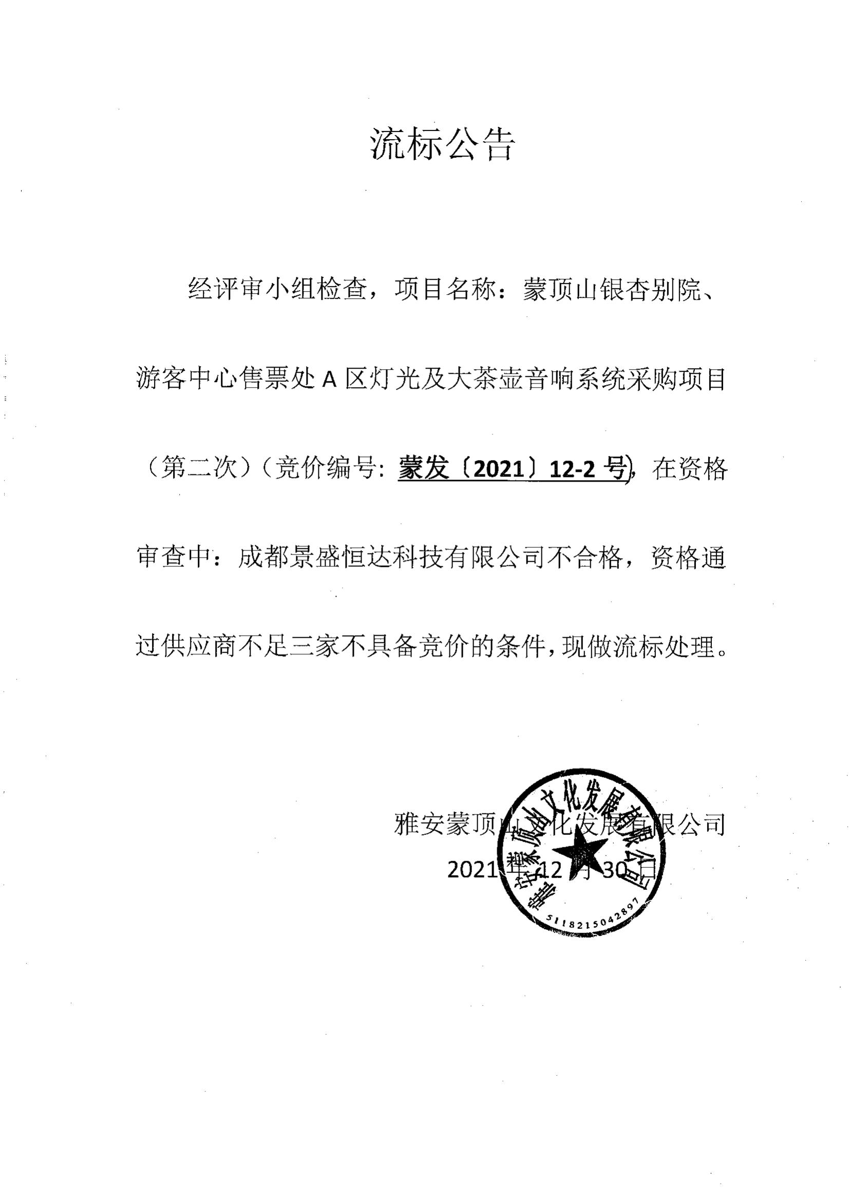 蒙頂山銀杏別院、游客中心售票處A區(qū)燈光及大茶壺音響系統(tǒng)采購項(xiàng)目(第二次)流標(biāo)公告