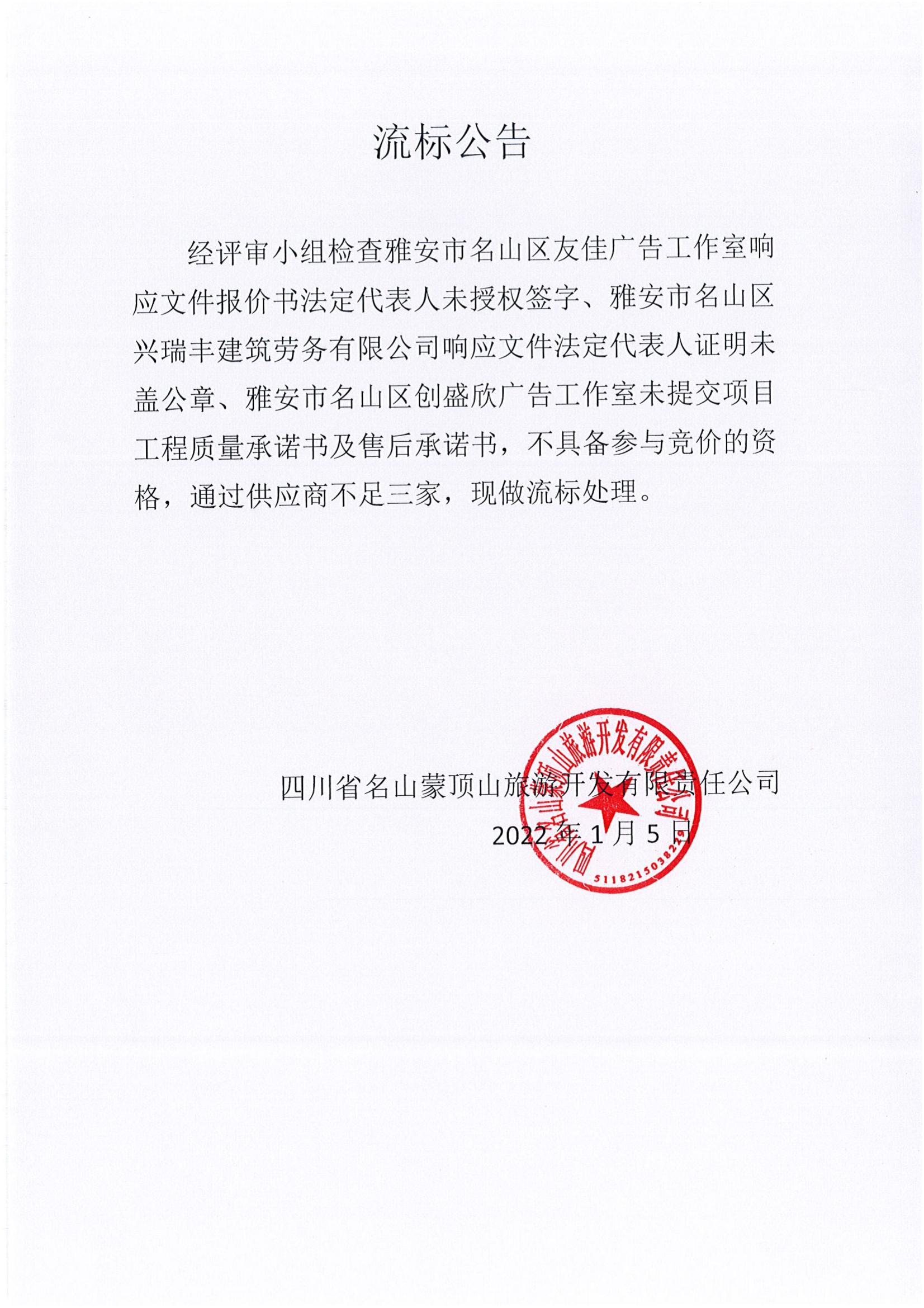 蒙頂山銀杏餐廳柴火雞長廊及銀杏樹下平臺(tái)設(shè)施改造提升項(xiàng)目供應(yīng)商資格審查流標(biāo)公告