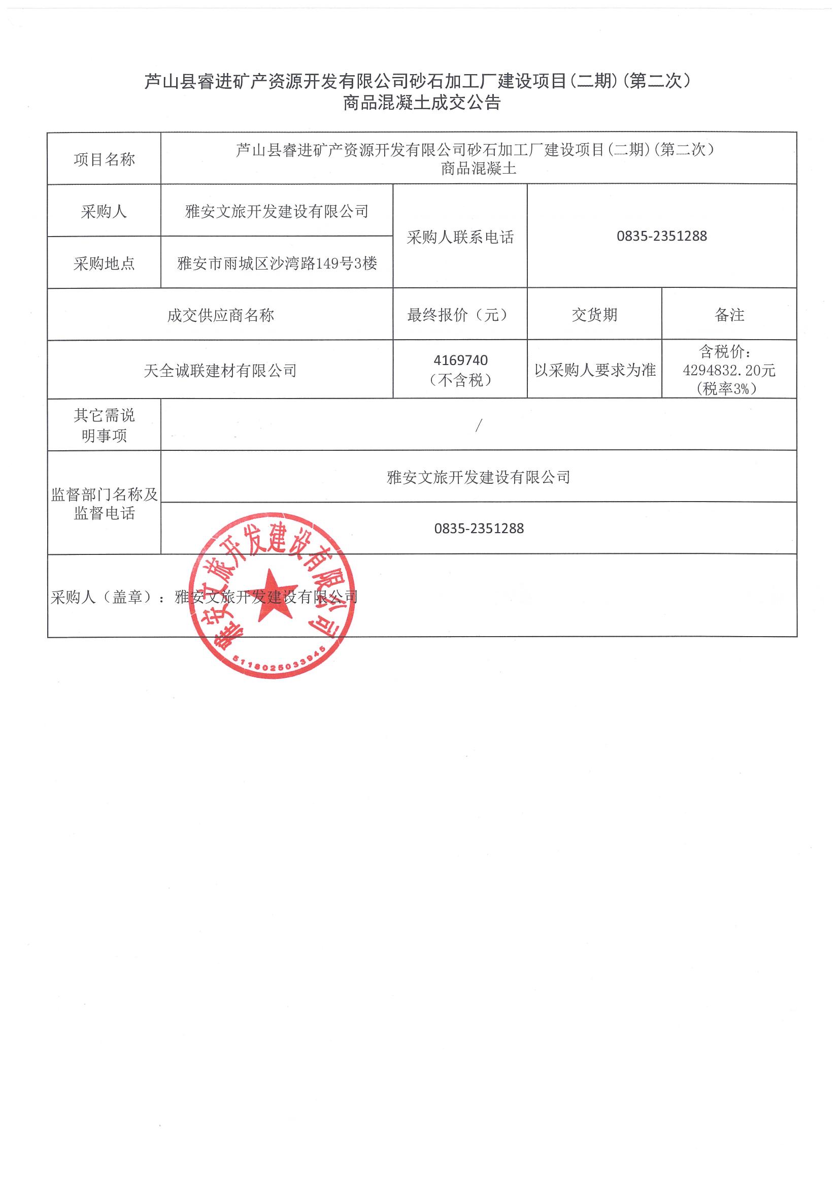蘆山縣睿進(jìn)礦產(chǎn)資源開發(fā)有限公司砂石加工廠建設(shè)項(xiàng)目(二期)(第二次》商品混凝土成交公告