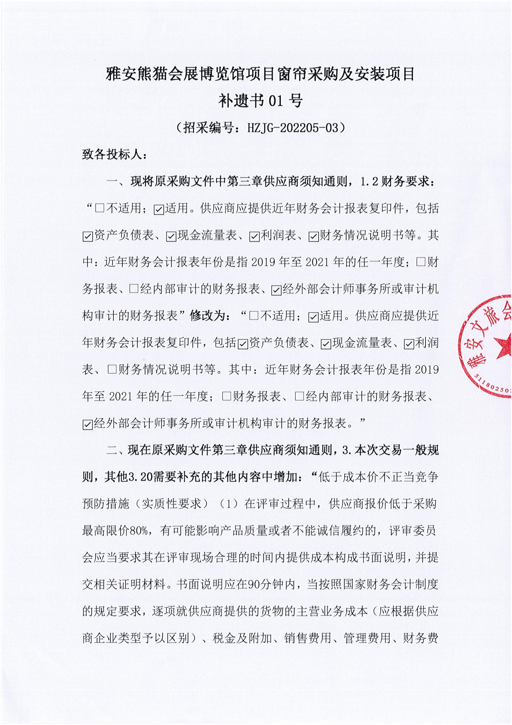 雅安熊貓會(huì)展博覽館項(xiàng)目窗簾采購(gòu)補(bǔ)遺書01號(hào)