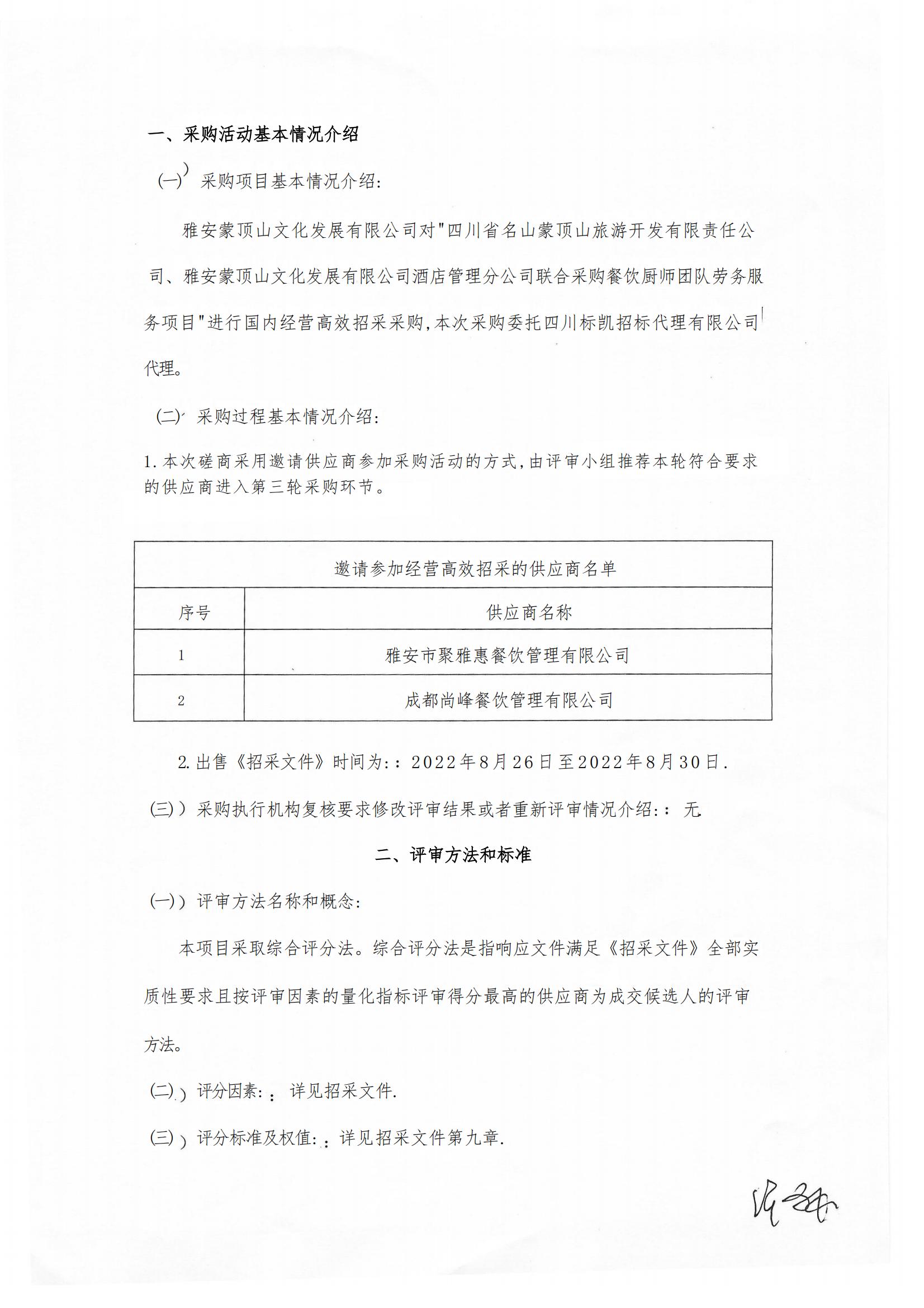 雅安蒙頂山文化發(fā)展有限公司酒店管理分公司聯(lián)合采購(gòu)餐飲廚師團(tuán)隊(duì)勞務(wù)服務(wù)項(xiàng)目評(píng)審報(bào)告