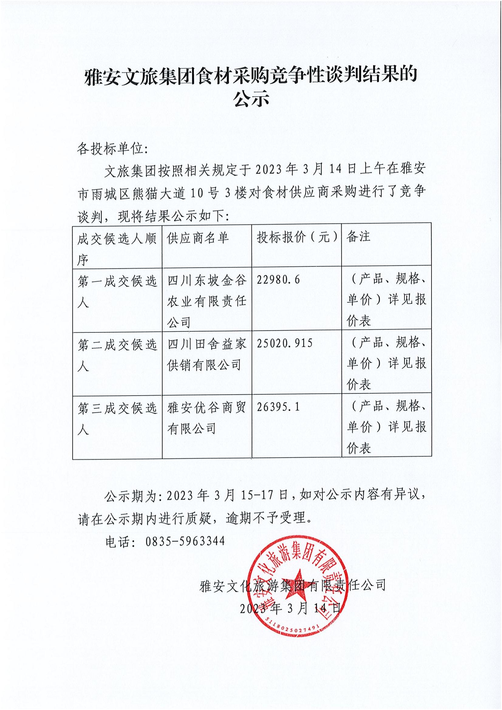 雅安文旅集團食材采購競爭性談判結(jié)果的公示
