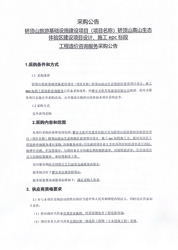 轎頂山旅游基礎(chǔ)設(shè)施建設(shè)項(xiàng)目(項(xiàng)目名稱)轎頂山高山生態(tài)體驗(yàn)區(qū)建設(shè)項(xiàng)目設(shè)計(jì)、施工epc 標(biāo)段工程造價(jià)咨詢服務(wù)采購公告