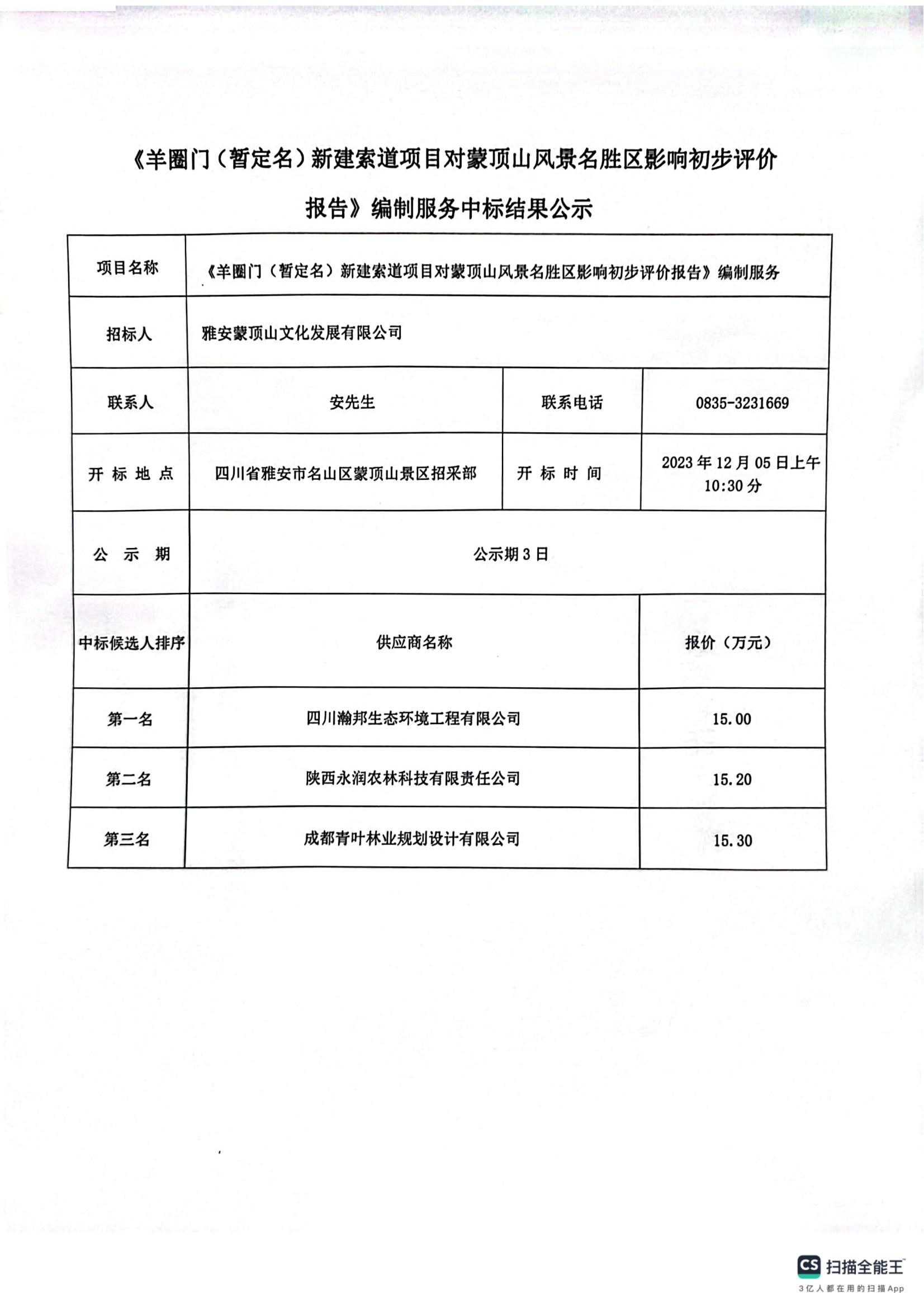 《羊圈門(暫定名)新建索道項目對蒙頂山風名勝區(qū)影響初步評價報告》編制服務(wù)中標結(jié)果公示