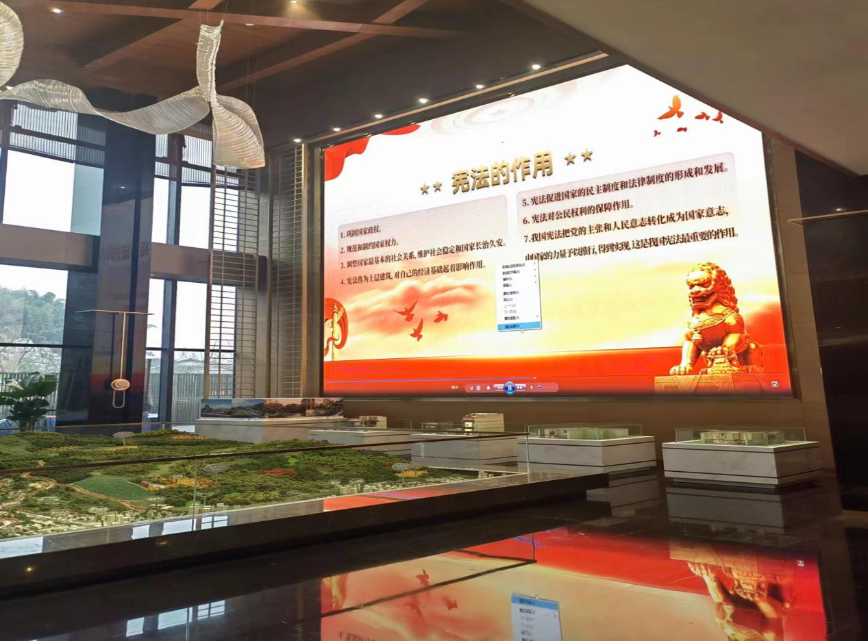 三是定點(diǎn)投放憲法宣傳標(biāo)語。為加強(qiáng)憲法宣傳,提高公民的法律意識(shí),同時(shí)起到時(shí)刻提醒公民關(guān)注憲法、了解憲法的作用,雅安文旅集團(tuán)通過酒店大屏、建設(shè)工地、房產(chǎn)銷售中心等多處電子宣傳屏投放憲法宣傳標(biāo)語,以此營(yíng)造良好的憲法宣傳氛圍,增強(qiáng)了憲法學(xué)習(xí)宣傳聲勢(shì),形成了規(guī)模效應(yīng)。